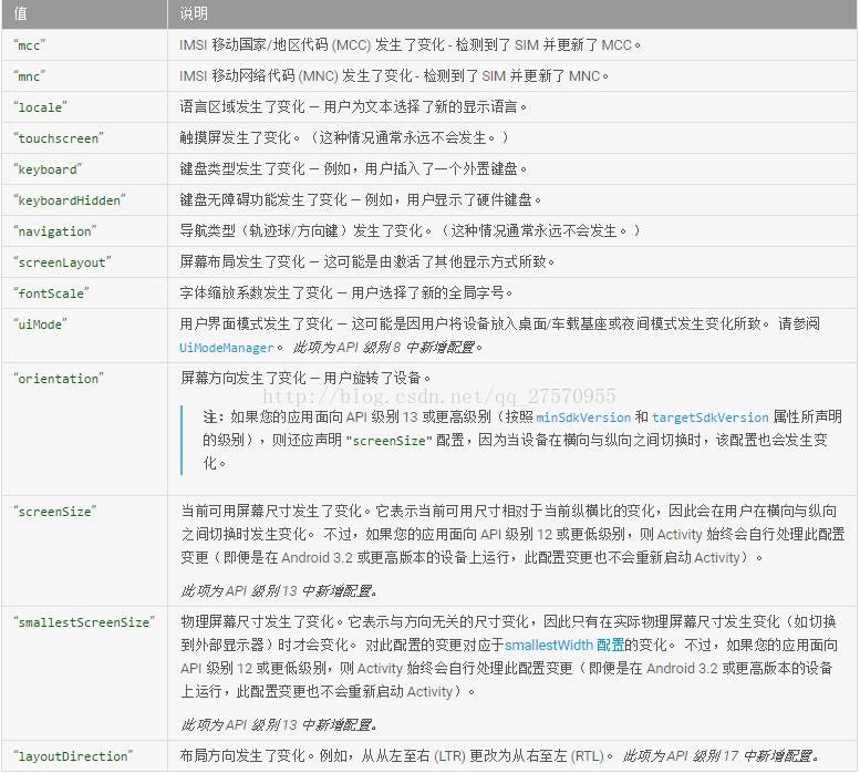 能不能不销毁呢,万一用户在输入数据(虽然可以通过Bundle savedInstanceState保存)。这个时候生命周期之外的一个函数上场了就是onConfigurationChanged()。其取值参考表: